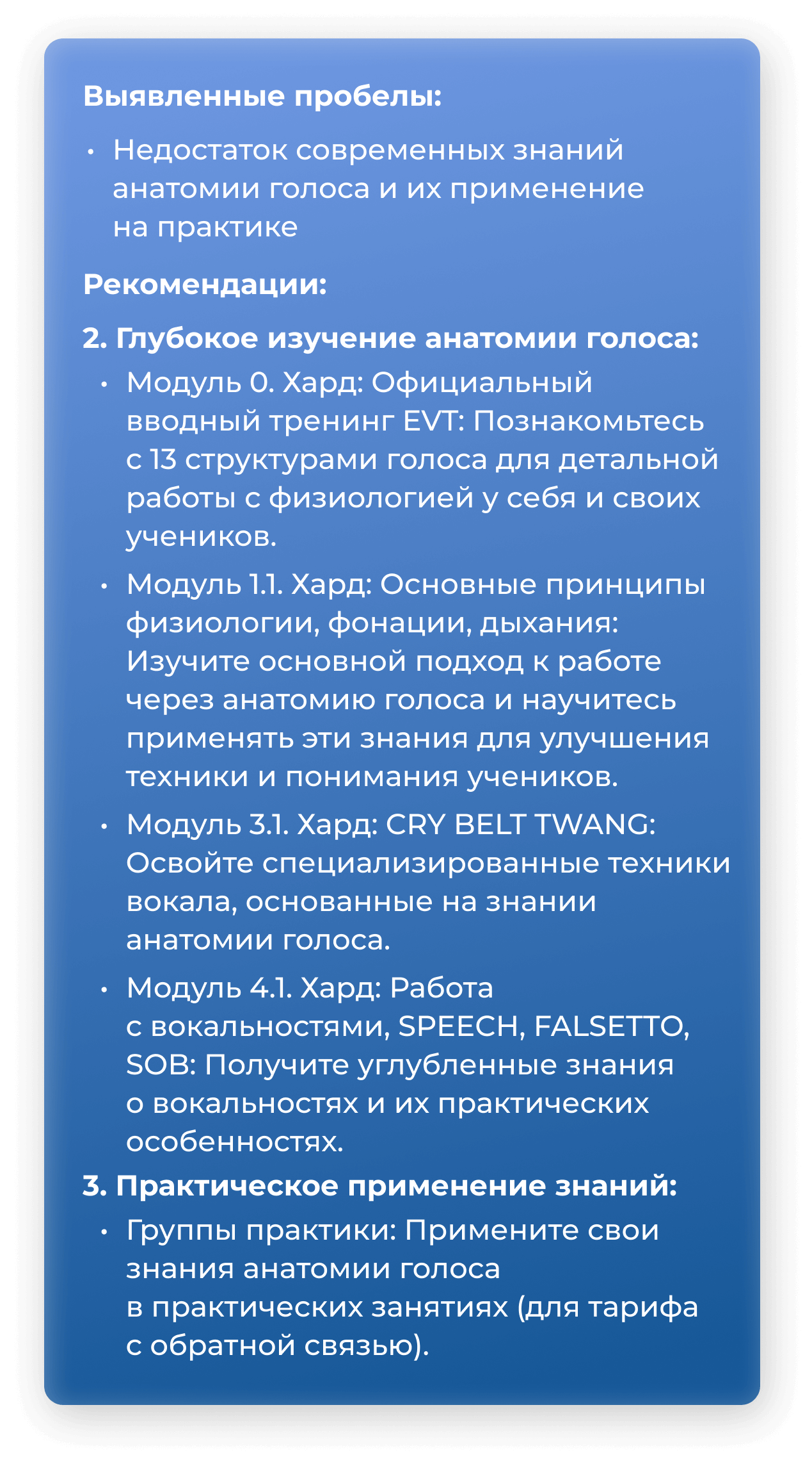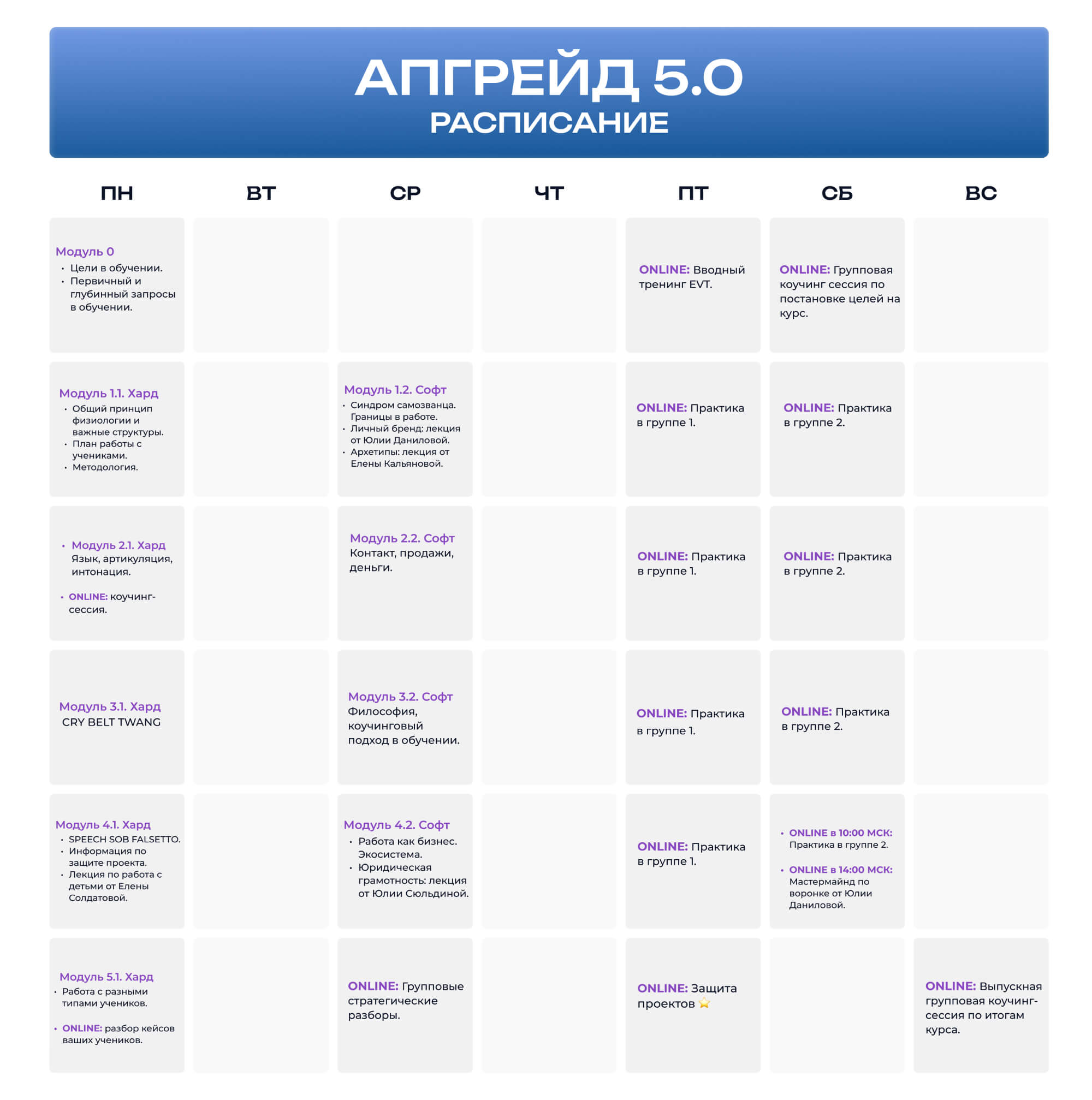 Курс «Апгрейд 5.0» создан специально для преподавателей вокала и вокалистов, стремящихся к профессиональному росту и совершенствованию своих навыков.