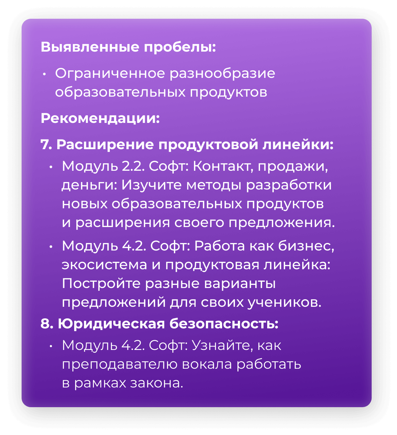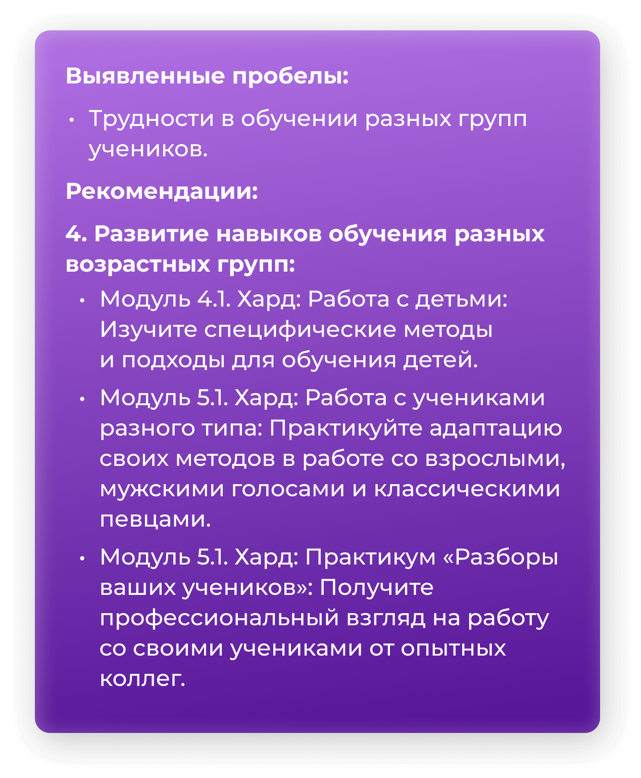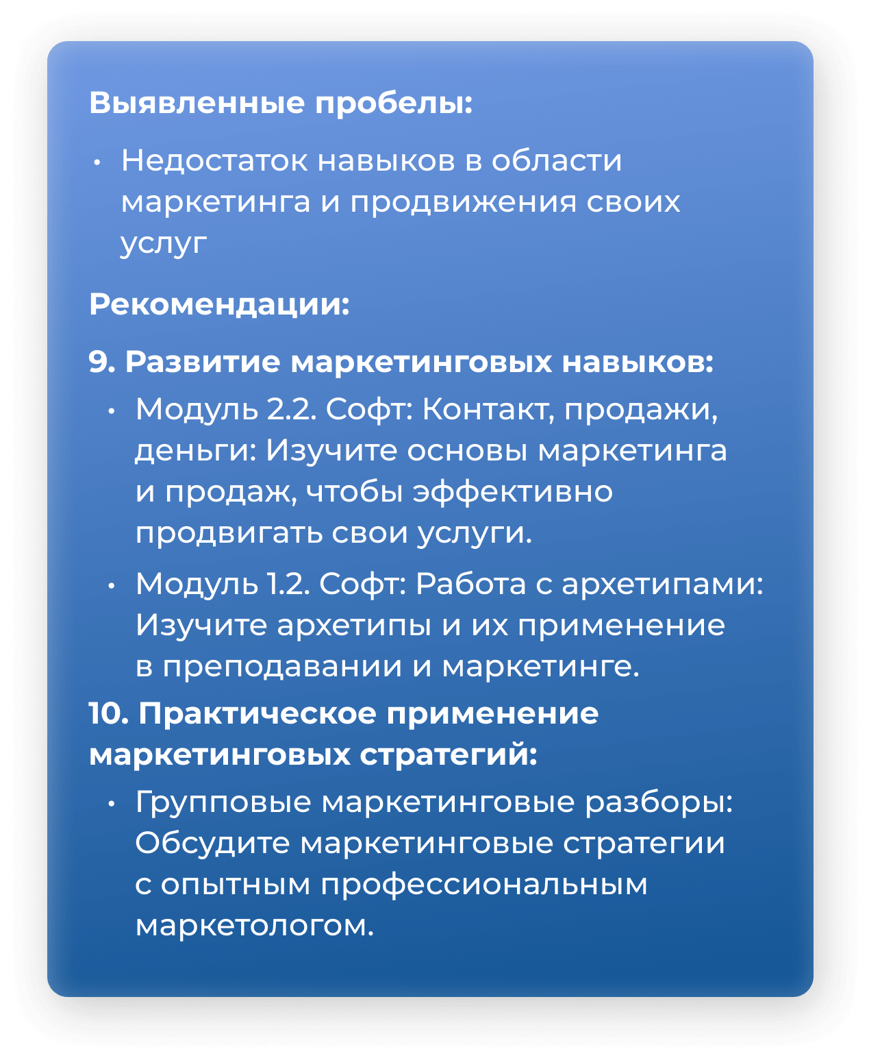 Пройдя тест, вы смогли выявить свои текущие сильные стороны и области, требующие улучшения. Здесь вы сможете увидеть, как программа «Апгрейд 5.0» поможет вам закрыть эти пробелы и стать более уверенным и успешным в своей профессии.